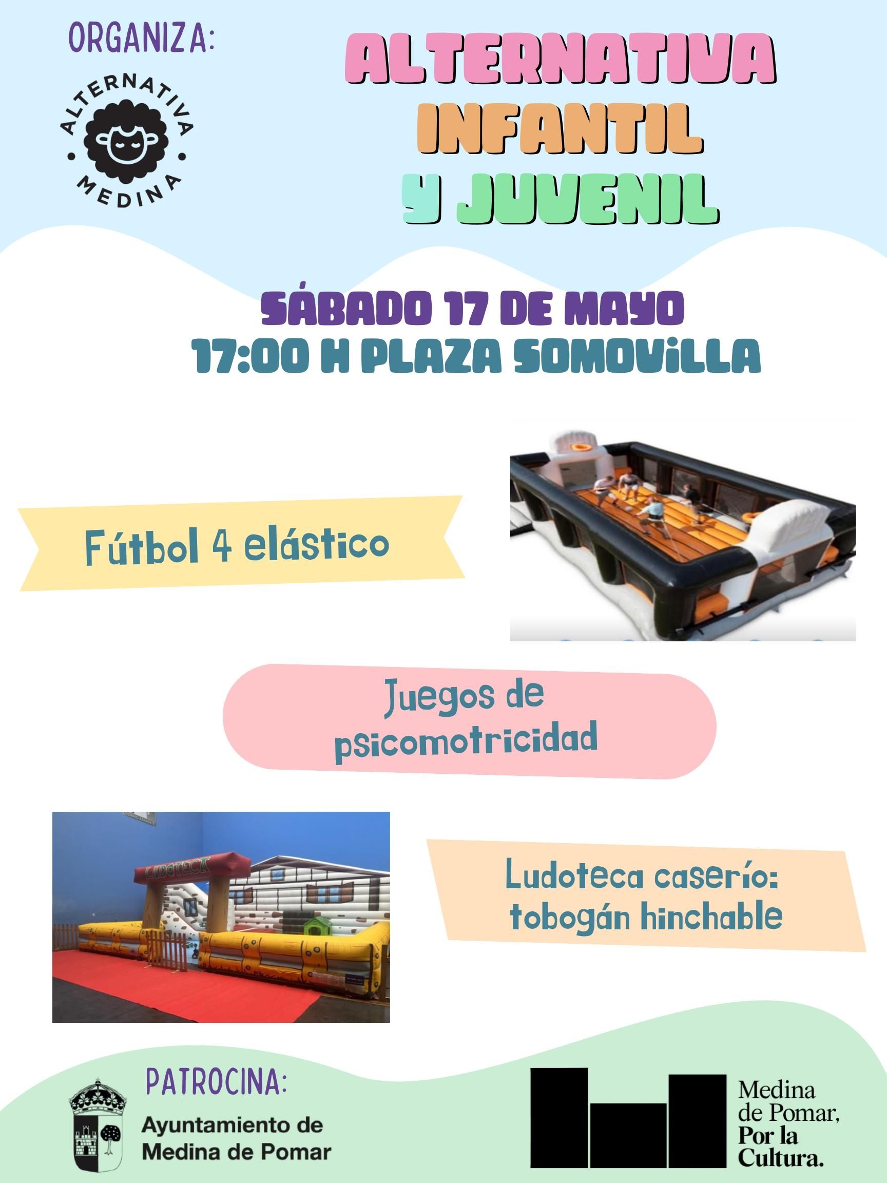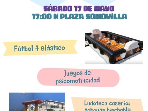 Fútbol 4 elástico, juegos de psicomotricidad, ludoteca caserío: tobogán hinchable, todo ello con música ambiente