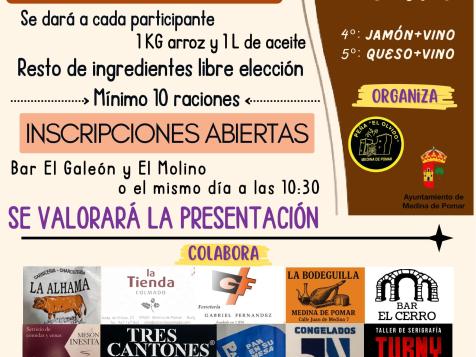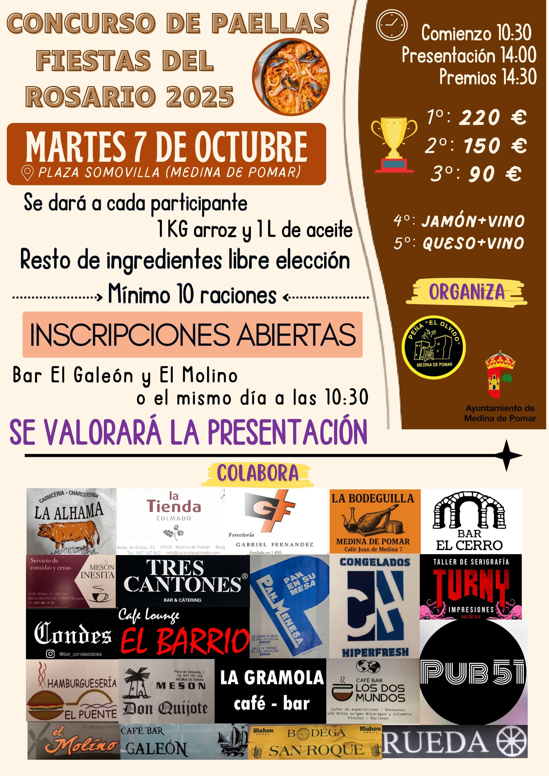 Plaza Somovilla - Medina de Pomar, Plaza Somovilla 5, Medina de Pomar 10:30 / 14:30 Martes, 7 Octubre 2025 CONCURSO DE PAELLAS Organiza: Peña El Olvido