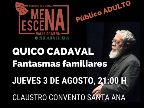 III Festival MenaEscena: Quico Cadaval, narrador oral, nos trasladará las historias de su Galicia natal con sus Fantasmas familiares para comprobar si las historias de la tradición oral son universales. Historias que se deformaron poco a poco, transformando un espectáculo de narración a las circunstancias ambientales, inclemencias del clima, las experiencias personales del artista y los terrores más íntimos del público. Por sus transitan espectros, valientes, milagreiros, pescaderas, marineros, mitos del rock, líderes religiosos, taberneras, reyes, golpistas, presos, adivinos, sicarios, prostitutas, agentes del orden, industriales, cantantes melódicos, ganaderos, pero no es seguro que aparezcan todos. Quico Cadaval demuestra desde el escenario que el acto de contar historias es una forma de conversación, aunque uno hable mucho más que los otros. Quico Cadaval ha paseado a sus fantasmas por prestigiosos festivales como el de Bucaramanga de narración oral en Colombia, Déjame que te Cuente, en Lima, Festival de Teatro de Almada, en Portugal, Festival Iberoamericano de Teatro de Bogotá, La Feria del Libro de La Habana.
